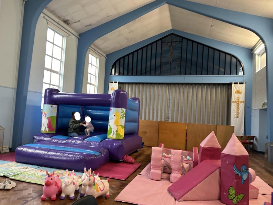 Low height unicorn theme bouncy castle and soft play hire, perfect for venues with low ceiling heights.