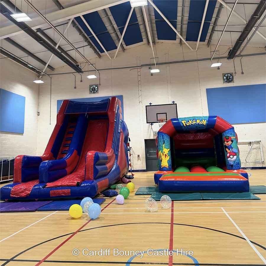 Bouncy castle and inflatable slide hire Pokémon Bouncy Castle + Super Slide in Cardiff, Barry, Penarth. This Pokémon theme bouncy castle pairs a spacious bounce area with a 12-platform super slide. The slide reaches a thrilling 14ft total height. Perfect for birthdays, school fetes, and family events. 🎉